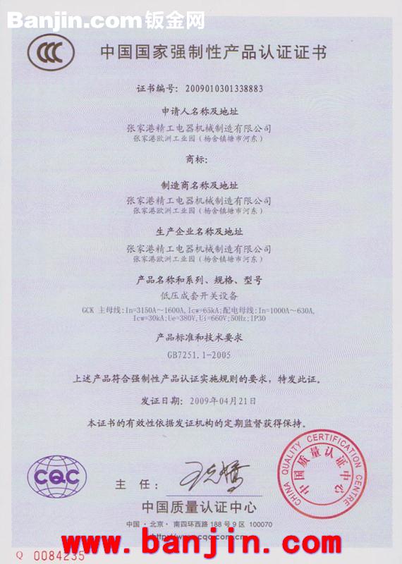 我公司有中国质量体系认证中心颁发的低压成套开关设备、交流低压动力箱、低压无功补偿装置、电表箱(配电板)模数化终端组合电器箱(配电板)、低压配电柜等的强制性产品认证证书。
